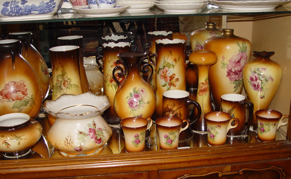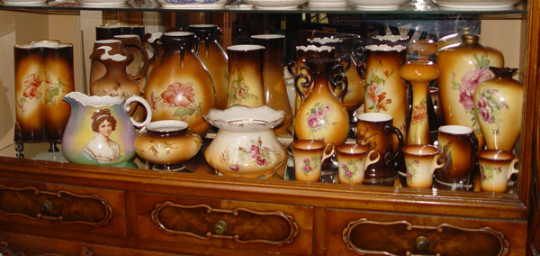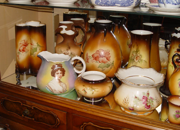 20 PIECE COLLECTION OF WARWICK CHINA: A variety of shapes and sizes of pitcher, vases, mugs, to include portraits, oak leaves, monks, American Eagle, and flowers. 3 1/2'' - 12''.