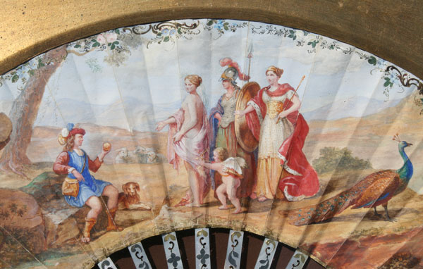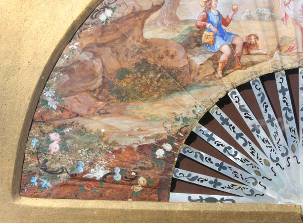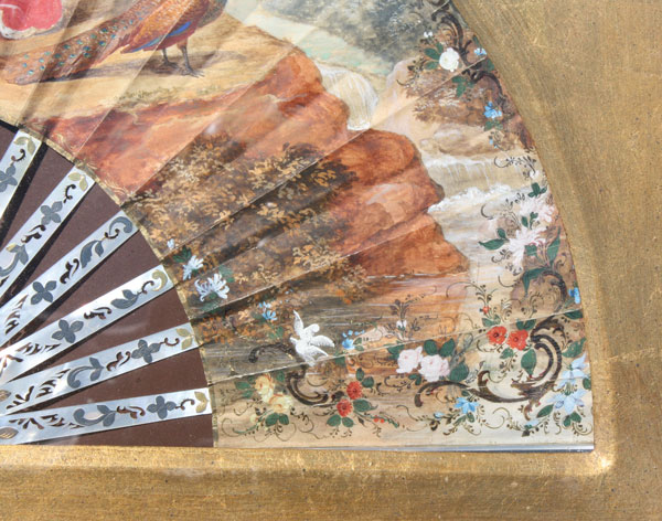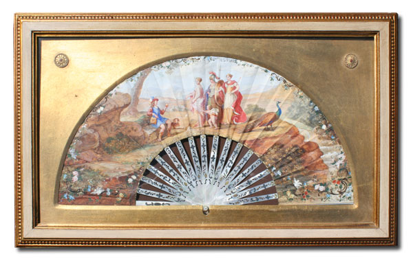 HAND PAINTED MOTHER OF PEARL FAN: In custom frame under glass. Hand painted in a Roman scene with figures and peacock, 26'' x 16'' overall.