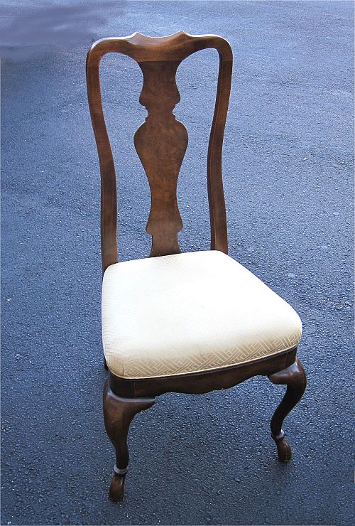 9 DREXEL HERITAGE QUEEN ANNE STYLE DINING ROOM CHAIRS: Single shaped splat, curved top rail, Cabriole legs. 1 arm chair, 8 side chairs. 42''h. x 21''w. x 18 1/2''d.