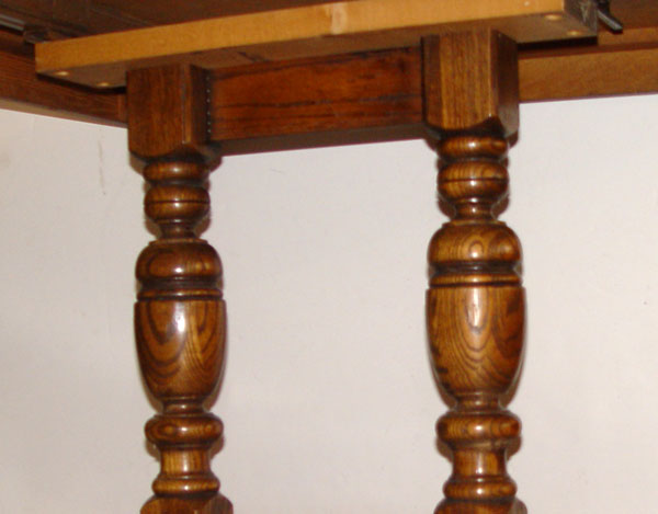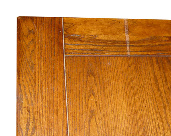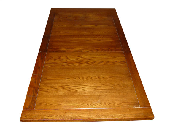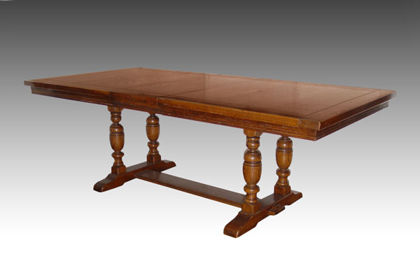 OAK TRESTLE DINING TABLE WITH LEAF: Large family table extends to 102''. 29'' wide, 29'' tall. The table is 72'' long without leaves, leaves are 15'' each.