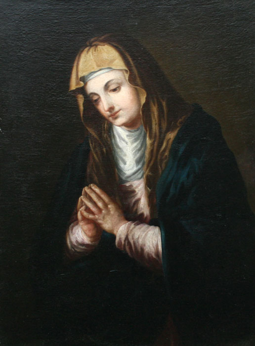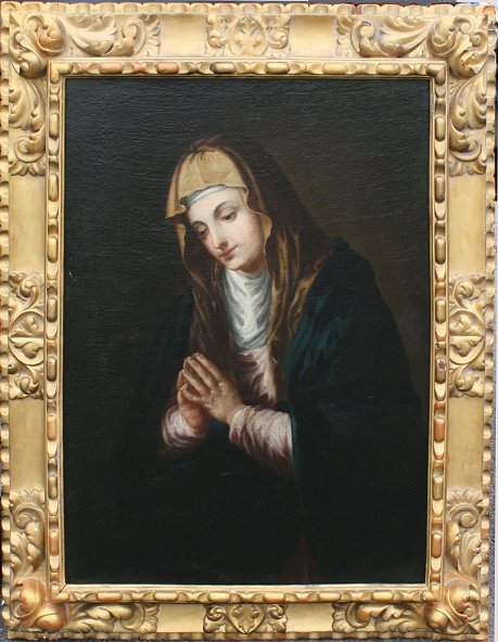 'THE MATER DOLOROSA'' PAINTING AFTER TITIAN: Probably early 19th or late 18th C., Oil/Canvas, 37'' x 27 1/2'', no visible signature, period carved, painted, and gilded gesso frame with wear and repair.