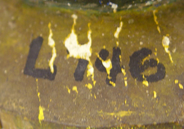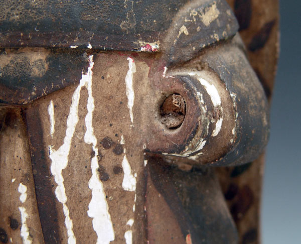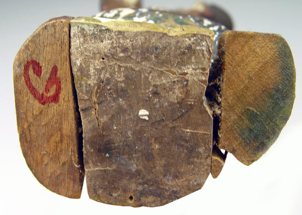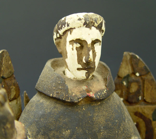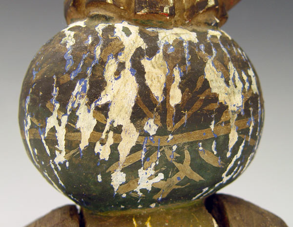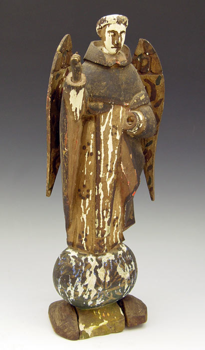 EARLY ANGEL SANTOS RELIGIOUS FIGURE: Carved wood with applied wings. Some remnants of paint, loss of hand and separations on base. 14'' tall.