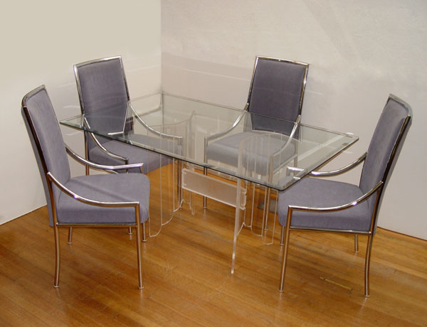 MODERNE GLASS TOP LUCITE BASE DINING TABLE WITH 4 CHROME FRAMES CHAIRS: Beveled glass top. Table measures 29'' h. x 60'' x 36''. Sold with 4 arm chairs, mauve upholstery. Chairs measures 39 3/4'' h. x 20 1/2'' x 24 1/2''
