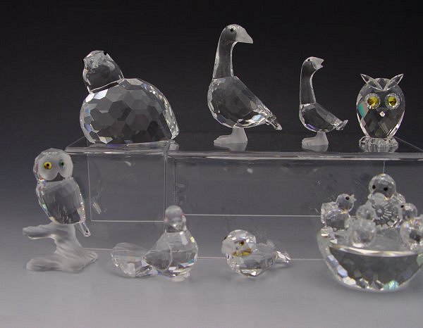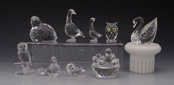 SWAROVSKI CRYSTAL BIRDS: Nine pieces to include, Mini Owl, retired, 1 1/4''; 1987 Bird's Nest, 2'' x 2''; 1988 Partridge (aka Quail),A. Stocker designer, retired 1990, 2 1/4''; 1989 Owl, Michael Stamey designer, 2 1/4''; 1992 Sparrow, C. Schneiderbauer designer, 1'' x 1 1/2''; 1993 Mother Goose, retired 1999, 2 1/2''; 1993 Dick Gosling, A Stocker designer, retired 1999, 1 3/4''; 1995 Dove, E. Mair designer, 1 1/4''; and a 1995 ''The Centenary Swan'', special commemorative edition with pedestal, 2''h.