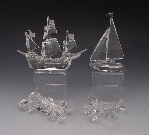 SWAROVSKI CRYSTAL 4 PIECES OF ''WHEN WE WERE YOUNG'': 1989 Old Timer Automobile, 3 1/4''; 1990 Airplane, 2 7/16''; 1991 Santa Maria Ship, 4 5/8''; 1994 Sailboat, 3 3/4''. All pieces have boxes.