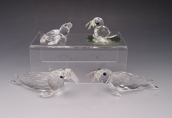 SWAROVSKI CRYSTAL SEALS, SEA LIONS & WALRUS: From the Kingdom of Ice and Snow series - 1985 Large Seal Var 2, M. Schreck designer, retired 1995, 4''l.; 1986 Baby Seal Var 2, Adi Stocker designer, retired 2005, silver nose and whiskers, tiny chip on back flipper, 1 1/2'' (comes with small round mirror); 1989 Walrus, Michael Stamey designer, retired 1993, 4''l.; and from the Aquatic Worlds - 1998 Baby Sea Lion, Michael Stamey designer, approx. 2''. Sold as a lot.