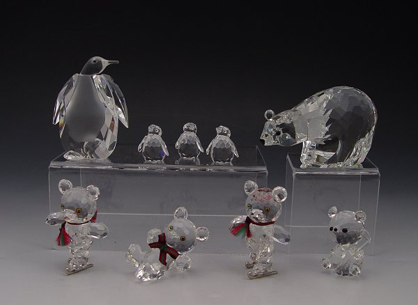 SWAROVSKI CRYSTAL KINGDOM OF ICE AND SNOW: 1986 Large Polar Bear, Adi Stocker designer, retired 1997, approx. 3 1/2''l.; Large Penguin by Zoo, approx. 2 1/2''h. watches over the 1997 Three Baby Penguins, Adi Stocker designer, 7/8''; two 1995 Kris Bear on Skates, Michael Zendron designer, retired 2004, approx. 2''h.; 1997 seated Kris Bear, Michael Zendron designer, retired 2001, approx. 1 3/4''; Hockey Bear by Zoo, approx. 1 1/2''. Sold as a lot.