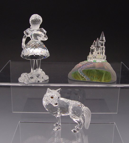 SWAROVSKI CRYSTAL ''FAIRY TALES'': Edith Mair designer, 1996 Red Riding Hood, retired 2004, 3 1/2''h., basket is missing handle cradled in her arm; 1996 Wolf, retired 2004, 2 1/2''. Sold with Magic Castle with unknown mark, 2 1/2''h x 2 5/8'' x 2.