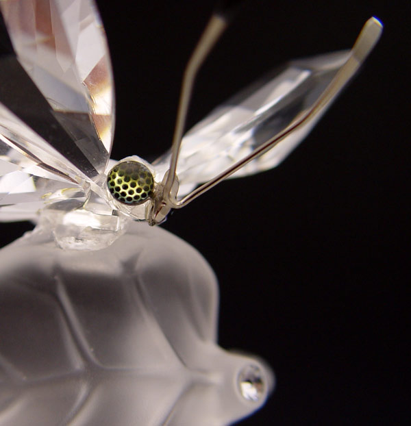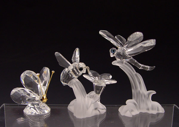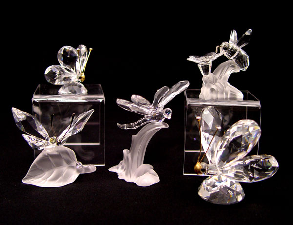 SWAROVSKI CRYSTAL 5 PC INSECT FIGURINES: C Schneiderbauer designer of 1992 Bumblebee or Bee on Flower, retired 1997, approx. 2''; and 1994 Butterfly on Leaf, Among Flowers and Foliage Collection, retired, 2 1/2'' x 2 1/2''; 1995 Dragonfly, retired 2006, approx. 2 1/2''h.; Team design of 1982 large Butterfly, retired 2006, approx. 2''; 1986 mini Butterfly, retired 2007, approx. 1 3/8''. All with boxes.