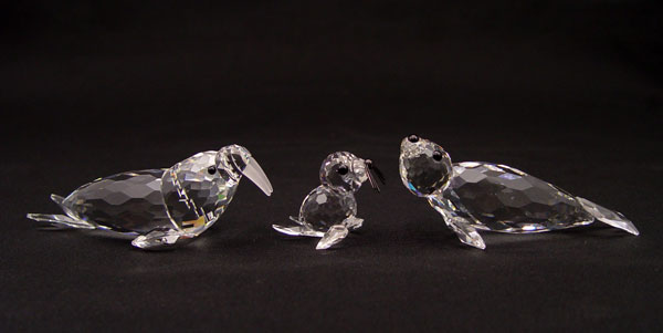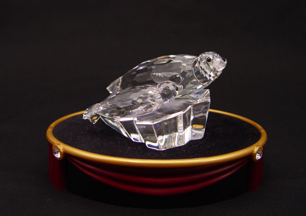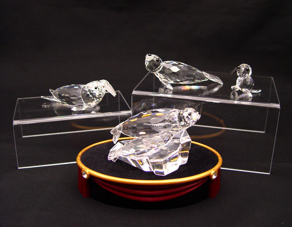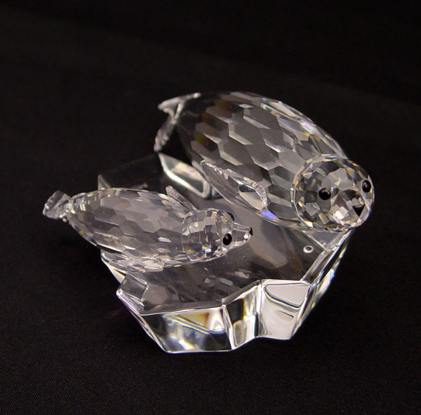 SWAROVSKI CRYSTAL 4 PC LOT OF SEALS: Featuring SCS Mother and Child Annual Edition 1991 ''Save Me'', The Seals, approx. 4 1/4''l. x 2''h., with display stand; 1986 Baby Seal, Adi Stocker designer, retired 2005, black nose and whiskers, 1 1/2''; 1985 Large Seal, black nose, Max Schreck designer, retired 1995, approx. 3 5/8''l.; 1989 Walrus, Michael Stamey designer, retired 1993, 4''l. All with boxes.