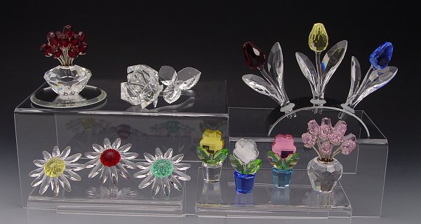 SWAROVSKI CRYSTAL FLOWERS: ''Exquisite Accents'' - 1993 Rose, Michael Stamey designer, 3 1/4''; 2003 A Dozen Pink Roses, Gabriele Stamey designer, retired 2008; Renewal Marguerite flowers - 1999 yellow, 2000 red and 2001 green; SCS Larger Tulips on stand 2003 Red, 2004 Yellow and blue, flowers 3 1/2''; three Medium Flowers, in pots, clear, yellow and pink, 1 7/8''h.; and 2002 Vase of Red Roses, 15 year Anniversary Collectors Society piece, 2 3/4''h., with mirror printed with designer G. Stamey signature, issued and retired 2002. Sold as a lot.