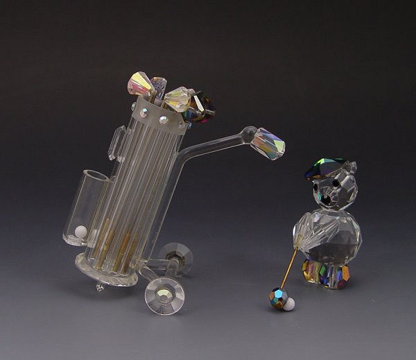 IRIS ARC CRYSTAL GOLFER & GOLF CLUBS: Adorable little crystal golfer with club and tiny white golf ball, 1 1/2''h. Sold with seven golf clubs in rolling bag with one more tiny ball, Bottom of bag marked, approx. 2 1/8''h. Iris Arc Crystal was America's first and premier designer of faceted crystal giftware, made with Swarovski vitrail crystal components for sparkle.