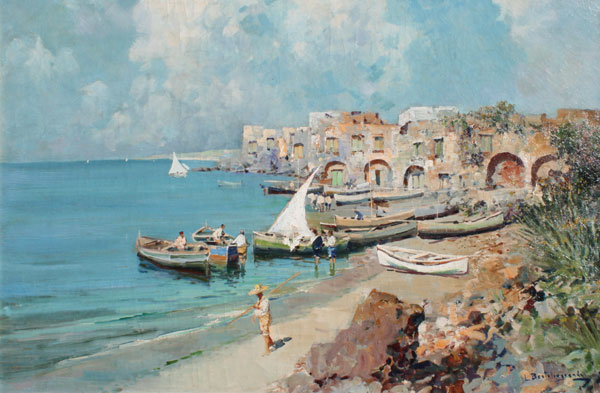 BERTOLINGRANDE, Luigi, (Italian, 19th/20th C,): Coastal Scene with Boats and Figures, OIL/Canvas, 25'' x 38'', signed, framed, 30'' x 43''.