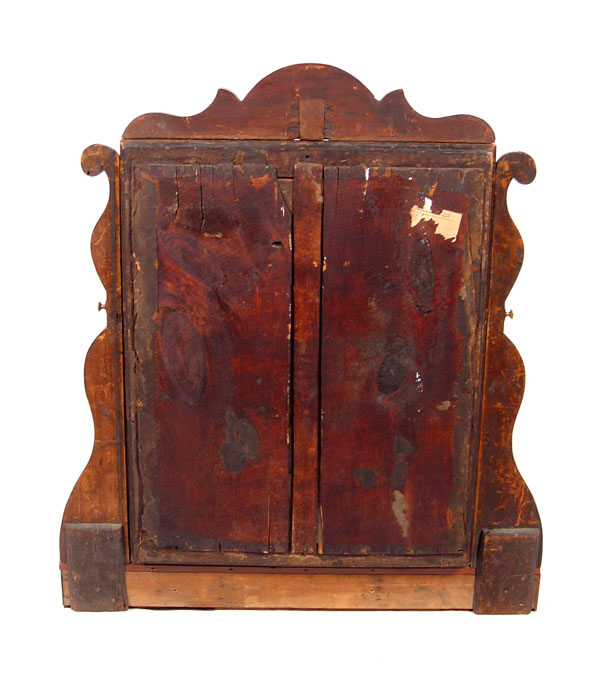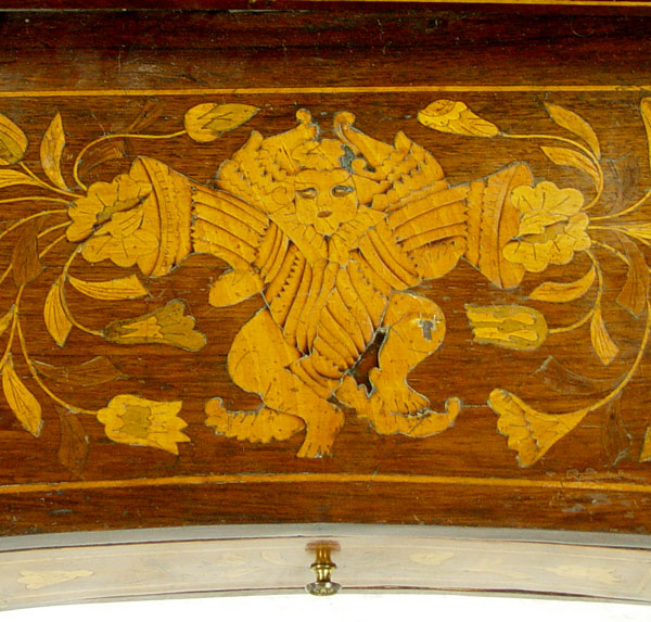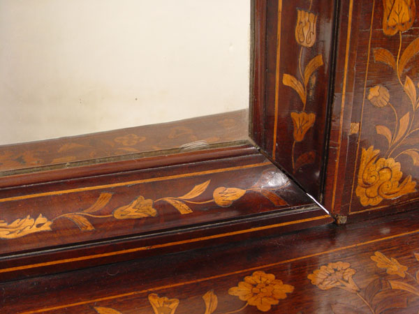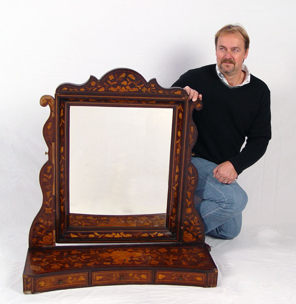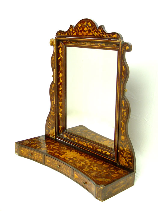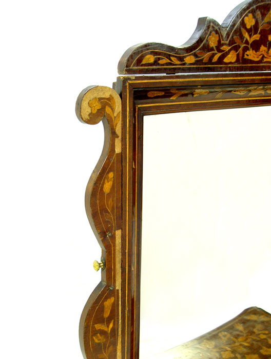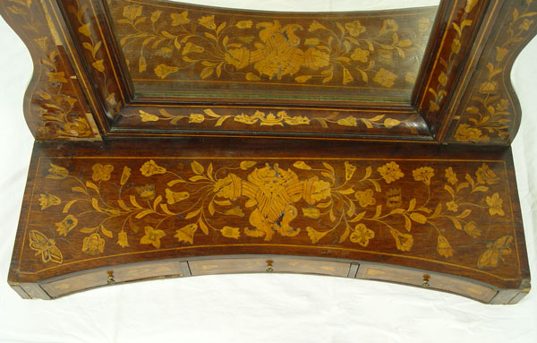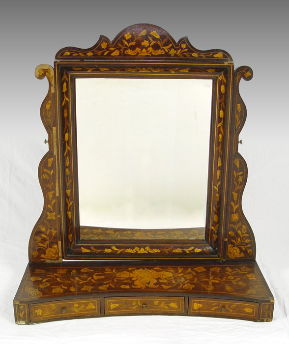 OVERSIZED 19TH C. DUTCH MARQUETRY DRESSING MIRROR: Japanese influenced inlay design. Curved front base with three drawers and single pull. Large swivel mirror with deep frame, resting in shaped stand with brass adjustable pins. 42'' h. x 37 1/2'' x 13''.
