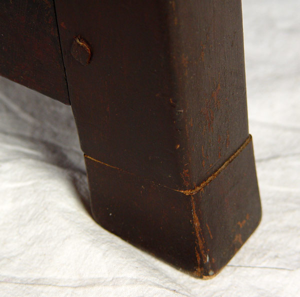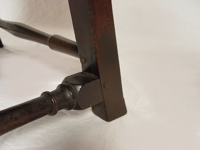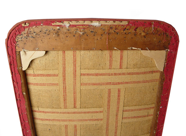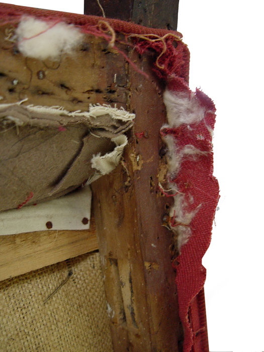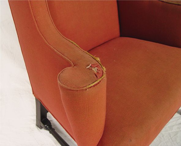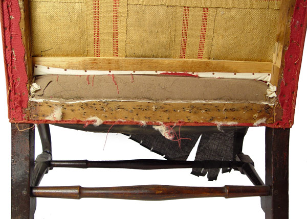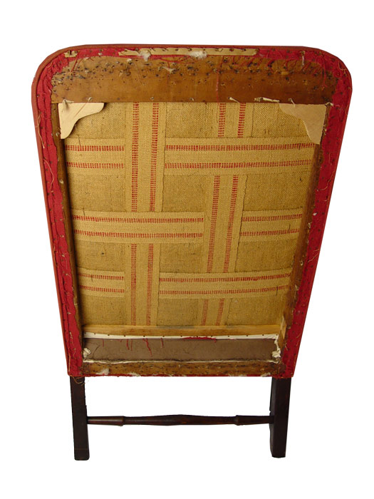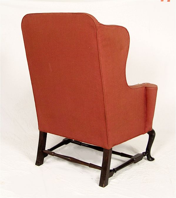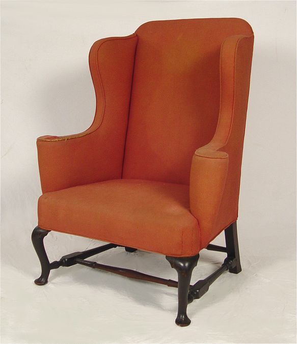 PERIOD QUEEN ANNE UPHOLSTERED ARM CHAIR, BOSTON MASS. Upholstered wing chair. Wide seat with outward rolled arm, cabriole legs with pad feet, ''H'' stretcher, pegged construction. Note: Need re-upholstering. Good solid frame. 37 1/2'' wide, 28 1/2'' deep, 46'' tall