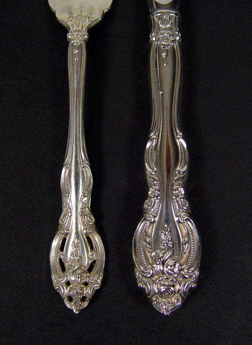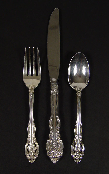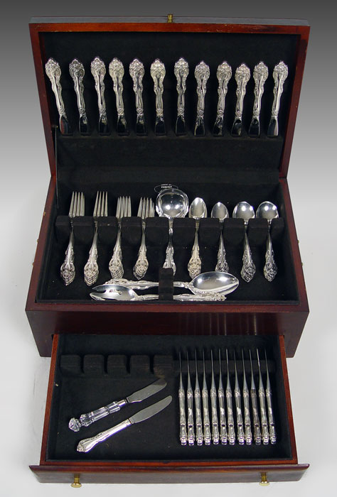 GORHAM LA SCALA STERLING FLATWARE SERVICE: Approx. 72 pieces in the La Scala pattern by Gorham Sterling to include 11 dinner forks (7 1/2''), 11 salad forks (6 1/2''), 12 teaspoons (6 1/4''), 10 soup spoons (6''), 12 hollow knives (9''), 13 hollow butter knives (6 3/8''), cream ladle (7''), tablespoon (8 3/4''), pierced tablespoon (8 3/4''). No monograms. Approx. 83.4 troy oz. Sold with single drawer silver chest, monogrammed plaque, 7'' x 18'' x 12''.