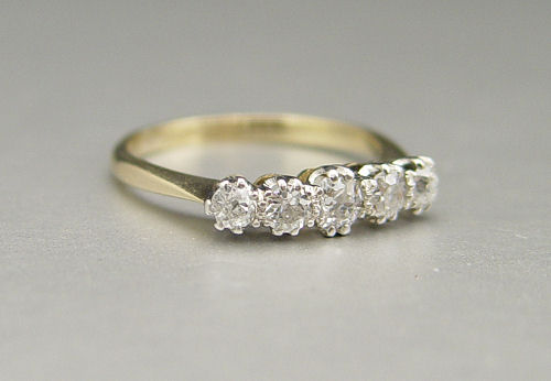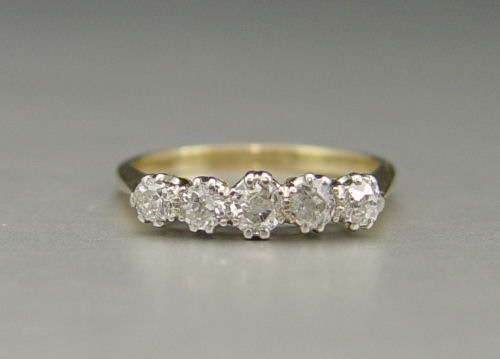 EDWARDIAN 18K & PLATINUM DIAMOND WEDDING BAND RING: 18K and platinum ring contains five old mine cut diamonds. Weight: .75 Ct. Approx. The diamonds average VS-SI in clarity and G-H in color. The diamonds are prong set. Weight: 2.5 grams. Size: 6