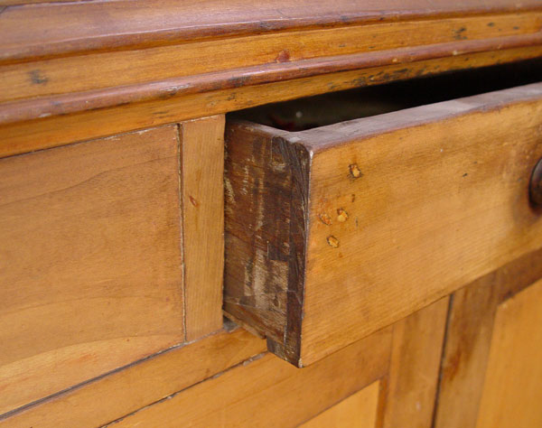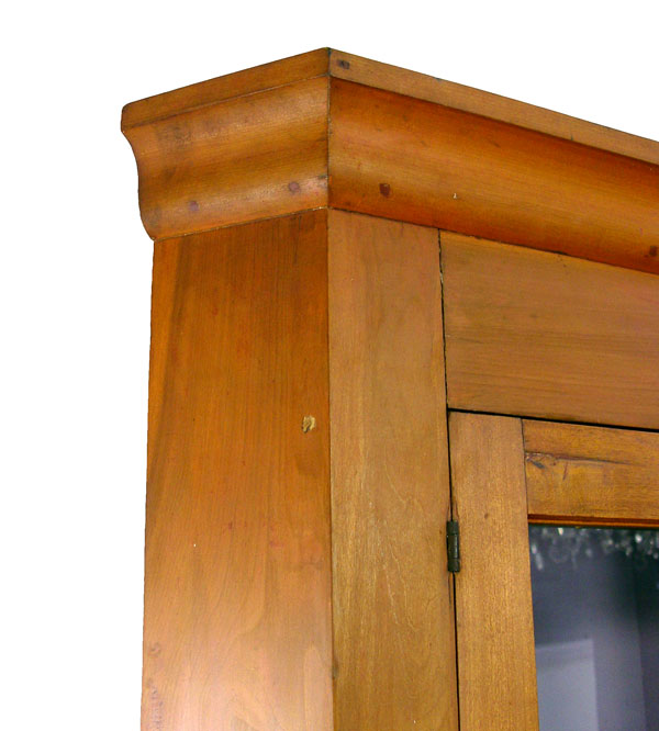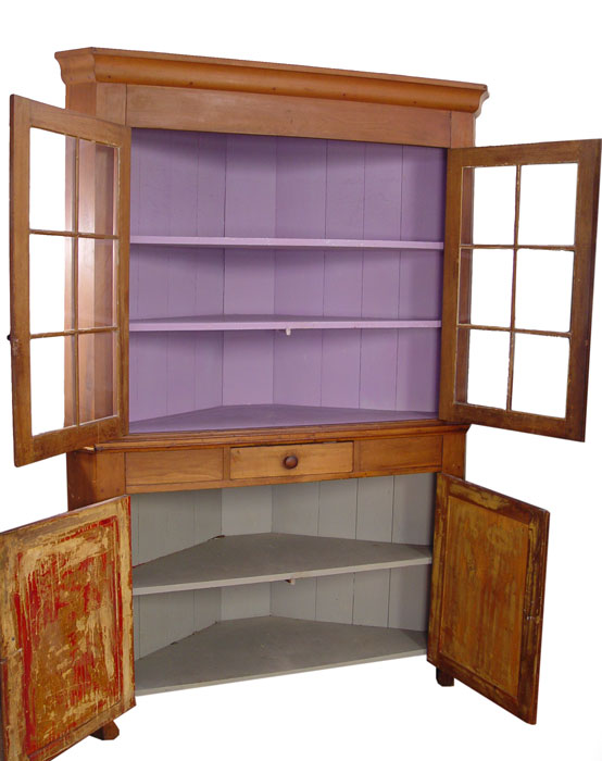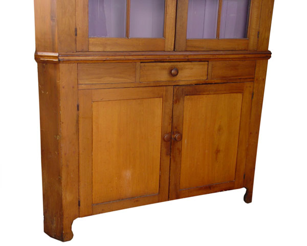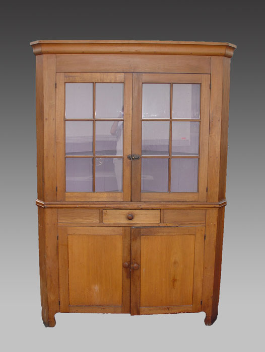 EARLY 19TH C AMERICAN COUNTRY OHIO CORNER CABINET: 2 part cabinet, 12 lite top, painted interior. Lower with central single drawer over doors. approx. 54'' across the front, 83'' tall.