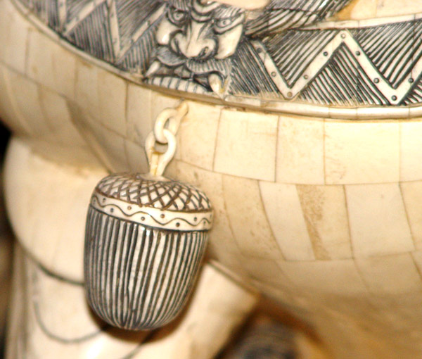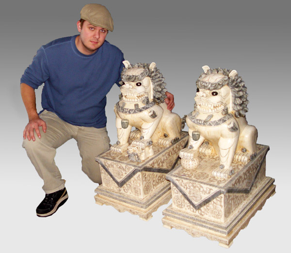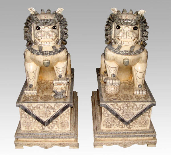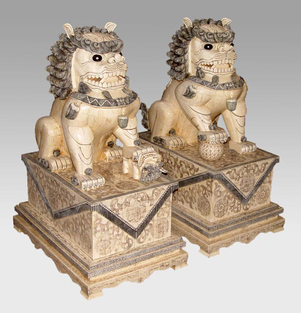 PAIR PALATIAL BONE CLAD FOO DOGS: Male and female, 35'' tall, the base is 25'' x 17''.