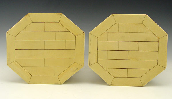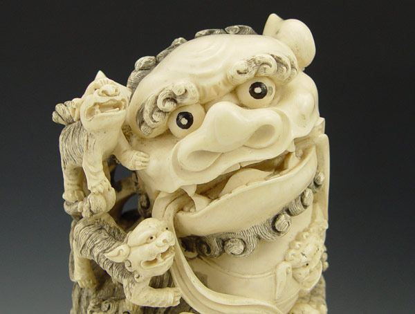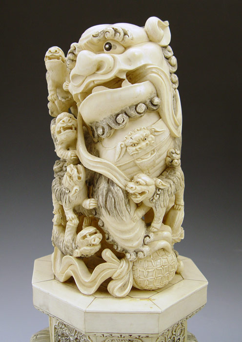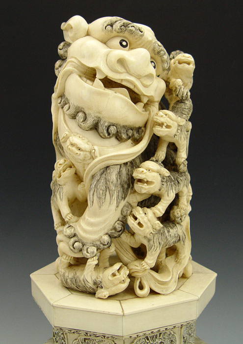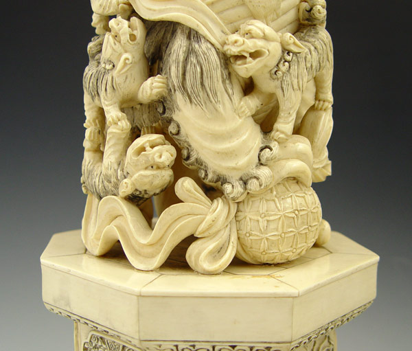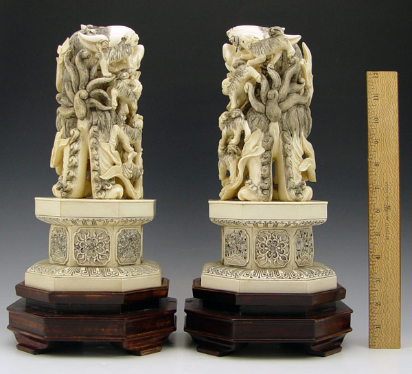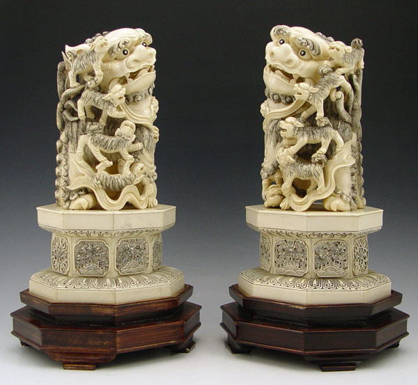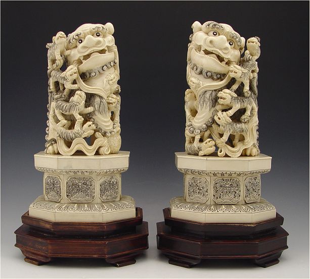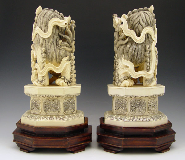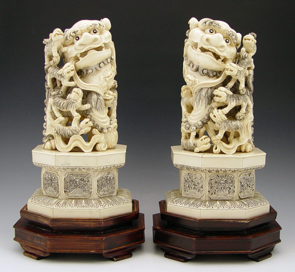 PAIR CHINESE CARVED IVORY FOO DOGS: Bone tile base 12'' h. x 6 1/2'' dia., excluding the wood base.