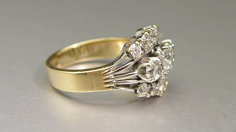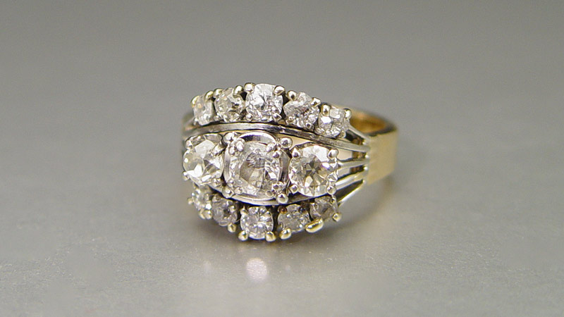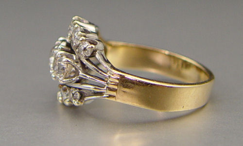 1.75 CT DIAMOND RING: 14K yellow and white gold ring contains thirteen old mine cut, old European cut and round brilliant cut diamonds. WEIGHT: 1.75 Ct. Approx. The diamonds average SI in clarity and H-L and Top Light Brown in color. The diamonds are prong set. Weight: 7.5 grams. Size: 9