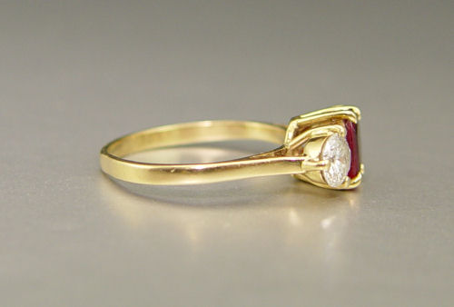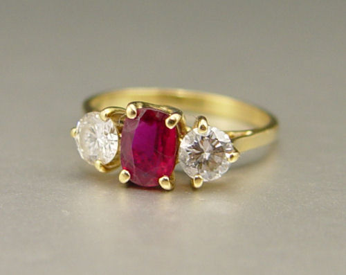 18k RUBY & DIAMOND 3 STONE RING: 18K yellow gold ring contains one oval shaped mixed cut ruby and two diamonds. Ruby weight, .60 Ct. approx., ruby is rated VS in clarity (Type II), slpR in Hue, 5 in Tone and 5 in Saturation. Two round brilliant cut diamonds. Weight: .57 Ct. Approx. The diamonds average SI2-I1 in clarity and H in color. The ruby and diamonds are prong set. Weight: 2.8 grams. Size: 5.5