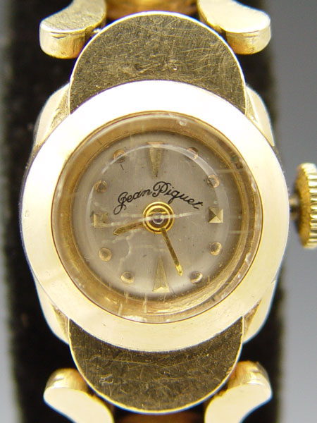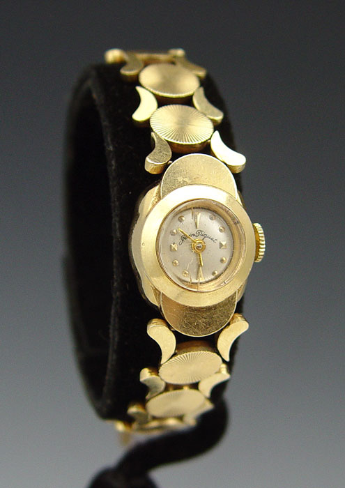 14K GOLD LADIES BRACELET WATCH CA. 1950: 14K yellow gold watch and bracelet band. 17 jewel AS 1012 movement in good running order. There is a crack in the crystal. Safety chain and clasp, will fit a wrist to 6''. 20.7 grams.