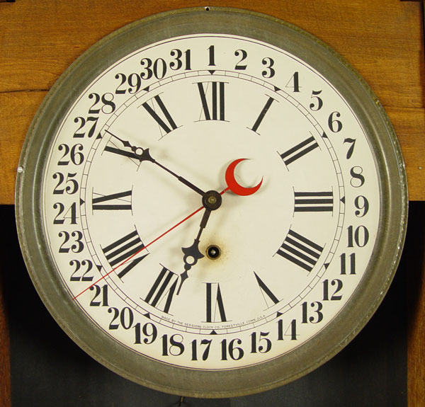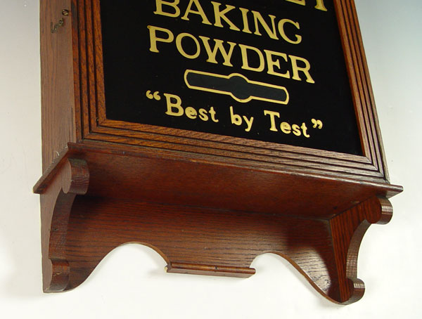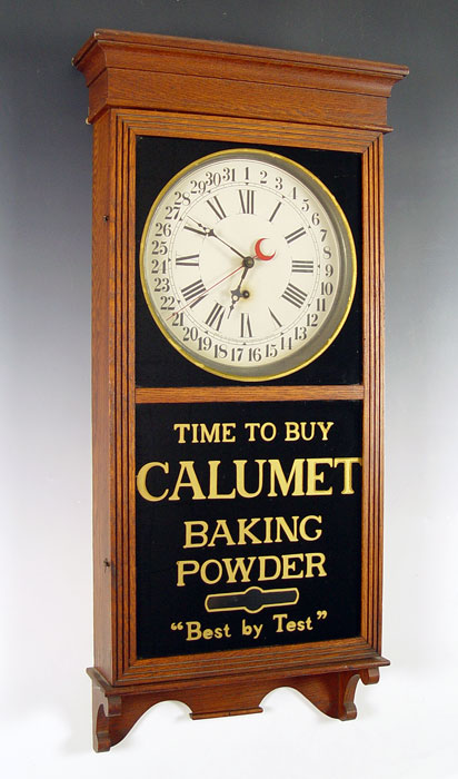 SESSIONS CALUMET BAKING POWDER ADVERTISING CLOCK: Oak case, Sessions movement with calendar hand. Original reverse painted glass. Measures 38'' h. x 17''.