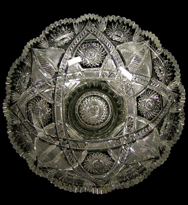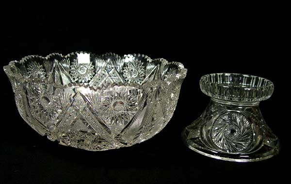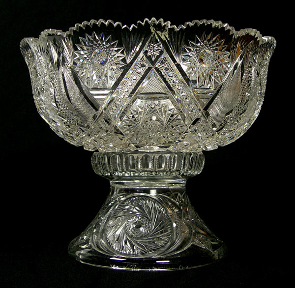 BRILLIANT PERIOD CUT GLASS PUNCH BOWL: Fine cut glass bowl with later pressed glass pedestal. Bowl is 14'' dia.