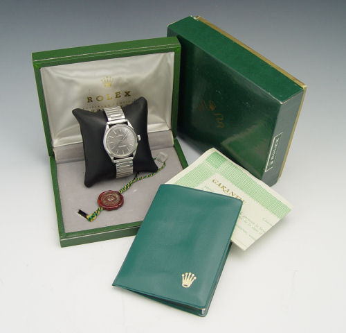 ROLEX OYSTER PERPETUAL WRISTWATCH CA. 1970: Genuine Rolex stainless steel chronometer watch on extension band. Serial number 2812294 matches the number on the included paper work. The model number has been worn away. The gray dial is original. 26 jewel 1570 caliber movement in good running order. Water resistant. Original box.
