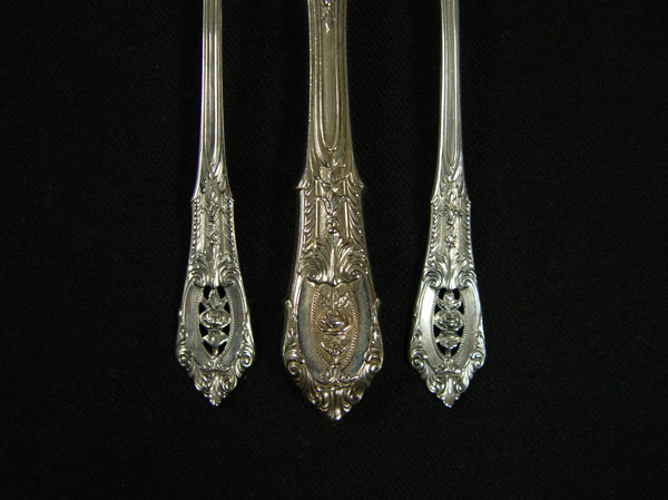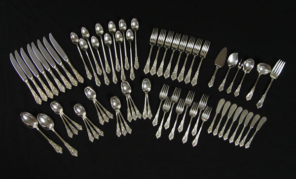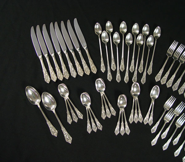 WALLACE ROSE POINT STERLING FLATWARE SERVICE: Approx. 68 pieces in the Rose Point pattern by Wallace Sterling to include 17 teaspoon (6''), 11 iced tea spoons (7 1/2''), 8 forks (6 7/8''), 8 salad forks (6 3/8''), 8 hollow knives (9''), 8 solid butter knives (5 1/2), 2 tablespoons(8 1/4''), serving fork (8''), cream ladle (6 1/4''), sugar scoop (5 1/8), jelly server (5 1/4''), hollow cheese server (6 1/2''), pickle fork (5 1/2''). Approx. 67.8 troy oz. No monograms.