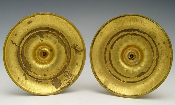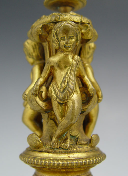 PR EARLY FRENCH DORE BRONZE CANDLE STANDS: With 3 putti figures on each. 6'' h x 3 1/2'' base dia. EXACT AGE UNKNOWN.