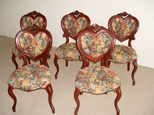 SET OF 5 KIMBALL HEART SHAPED DINING CHAIRS: Mahogany Victorian style sweetheart side chairs. Sold with copy of original sales receipt for $379 each.