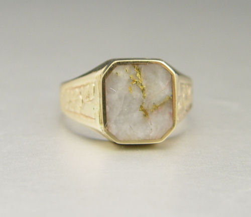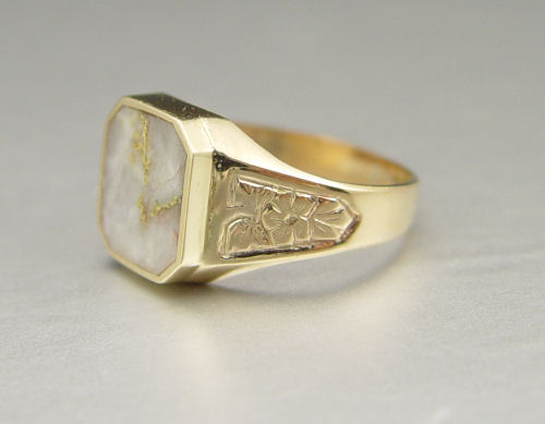 GENTS OR LADIES GOLD QUARTZ RING: 10K yellow gold ring contains one tablet of gold quartz. The quartz is bezel set. Weight: 5.9 grams. Size: 9