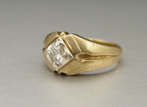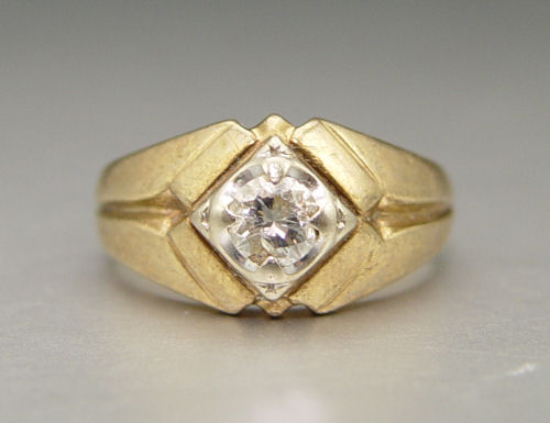 GENTS DIAMOND RING: 14K yellow gold man's ring contains a single .50 Ct round brilliant cut diamond. The diamond is rated I2 in clarity and K-L in color and is chipped. The diamond is prong set. Weight: 6.0 grams.