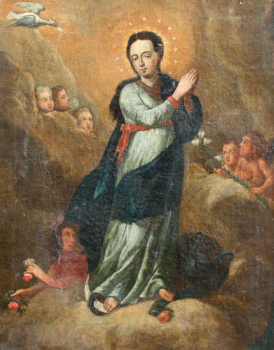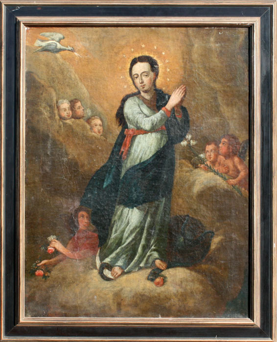 18th C.? SPANISH RELIGIOUS PAINTING: OIL/Canvas, 33'' x 25 1/2'', ebonized frame, 38'' x 31'', no visible signature.