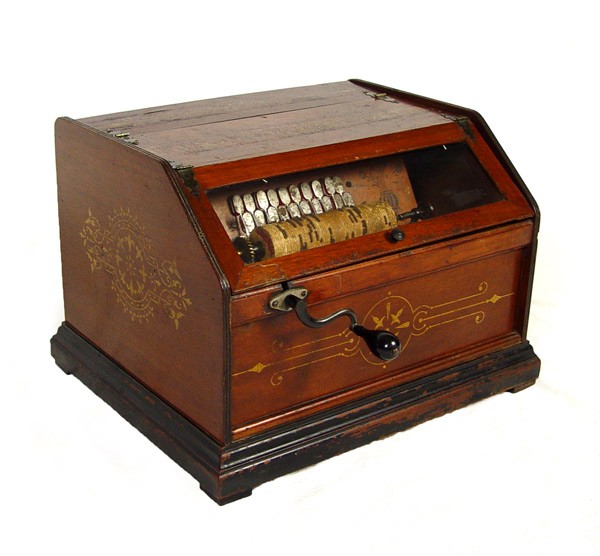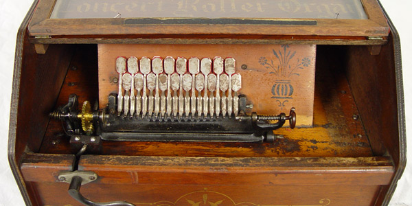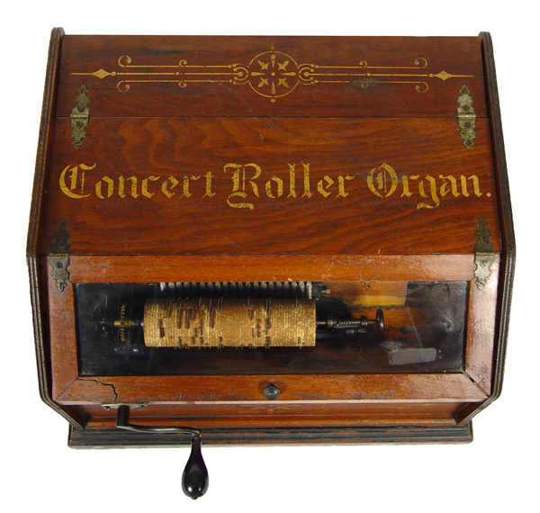 CONCERT ROLLER ORGAN: Currently in working condition. Sold with large collection of approx. 64 cobs. Measures 12 1/2'' h. x 18 1/4'' x 15''