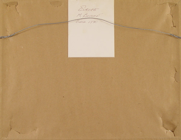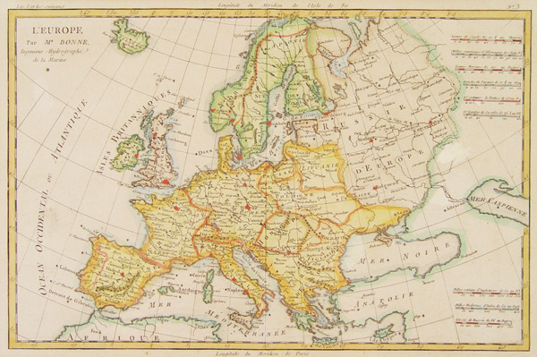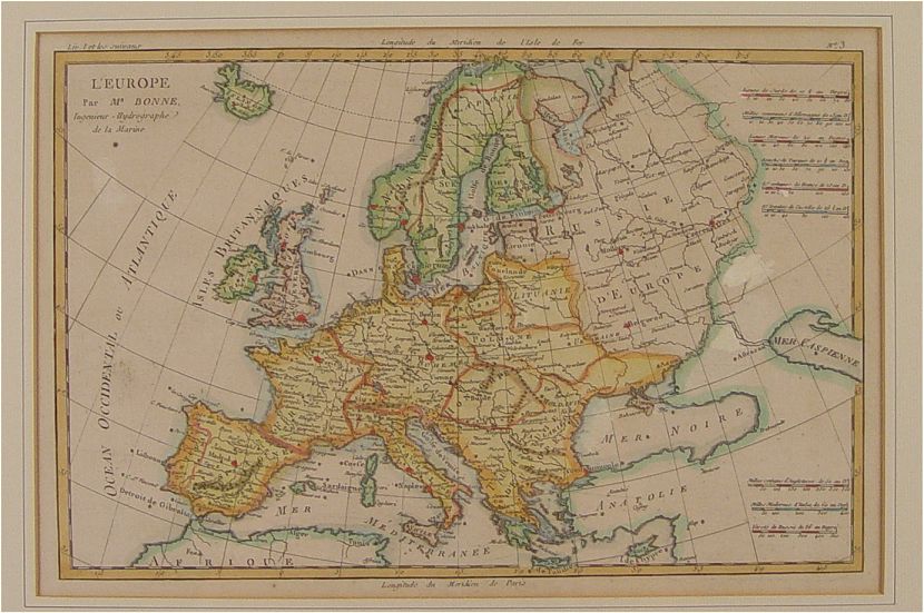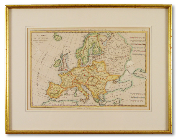 CIRCA 1770 BONNE MAP OF EUROPE: Hand tinted, produced by Bonne, circa 1770's. Sight size 8 3/4'' x 13''. framed & matted 13 3/4'' x 18''.