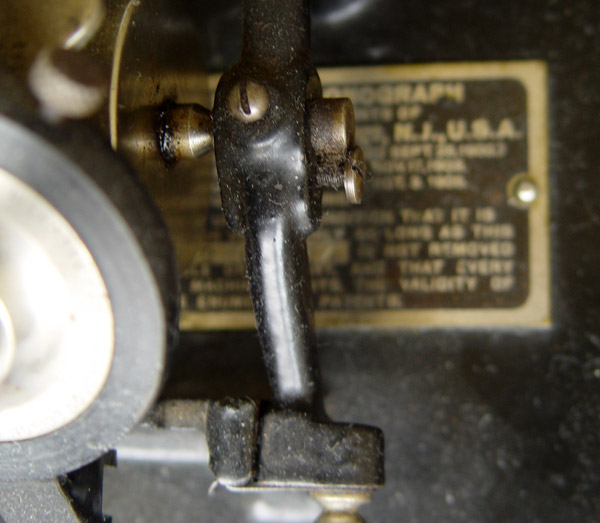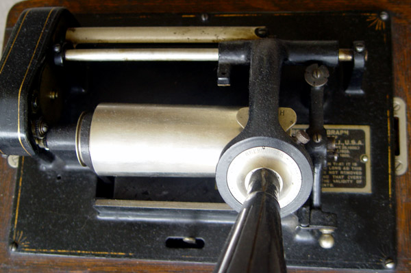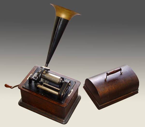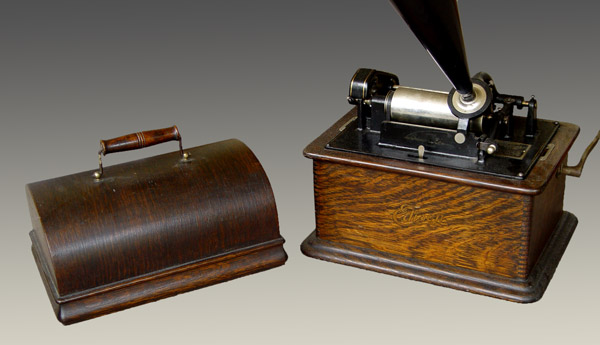 EDISON STANDARD CYLINDER PHONOGRAPH: Oak case with last patent date of Oct. 1905. Serial number 520174. Simple Edison in script on front of case. 14'' steel horn with brass bell. Measures 11 1/2'' h. x 13 1/8'' x 9 1/2''.