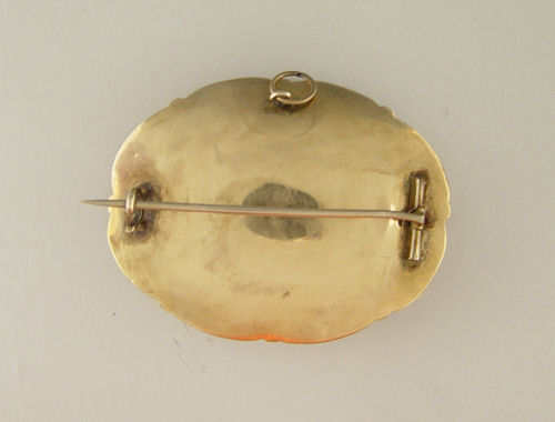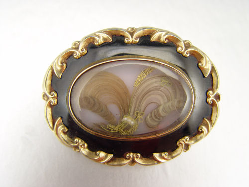 VICTORIAN ENAMELED MOURNING PIN / PENDANT: Heavy gold plated Victorian mourning brooch. Black enameled frame with scroll design. Floral design of hair, seed pearls and thread. Bar pin closure.