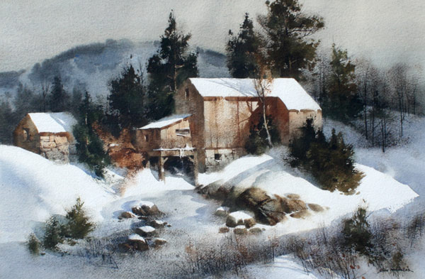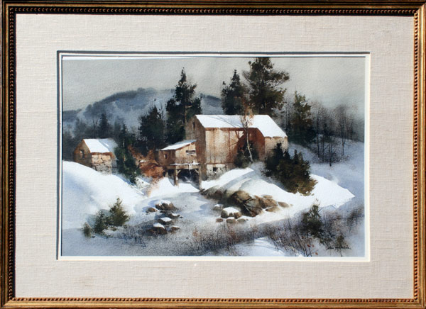 NICHOLAS, Tom, (American, 1934-): Snowy Mill, Watercolor, sight size 16'' x 23'', signed, framed, 24 3/4'' x 33 1/4''.