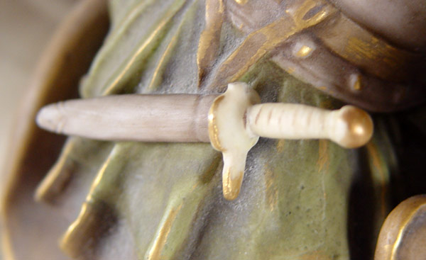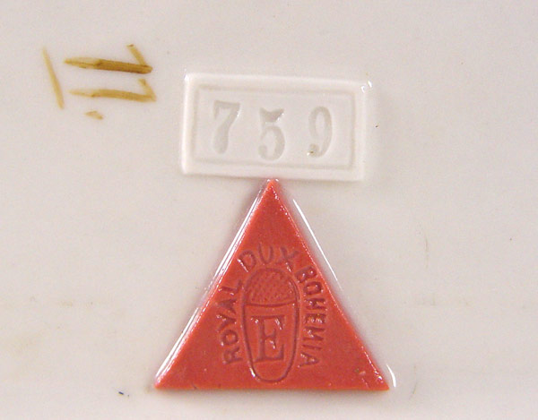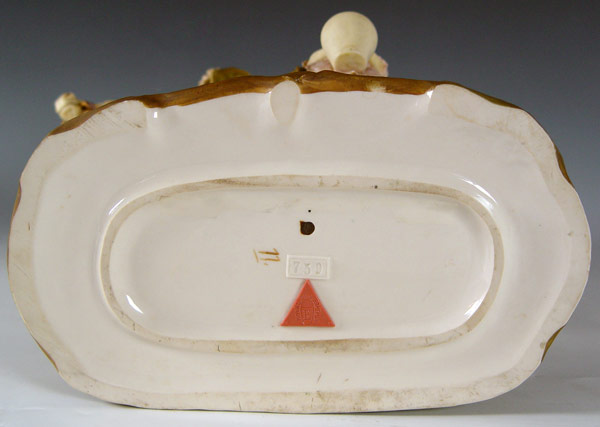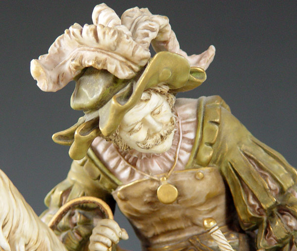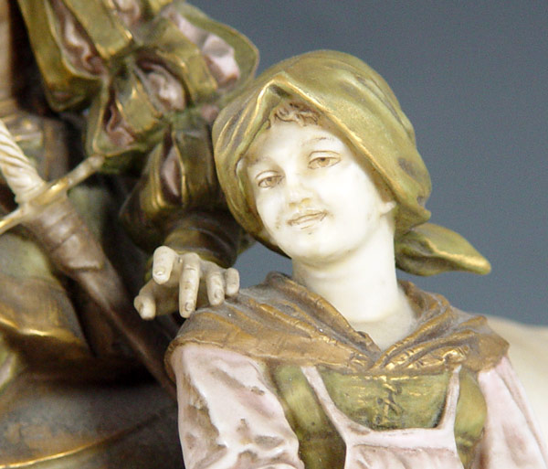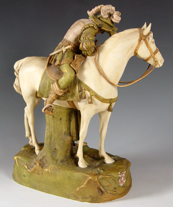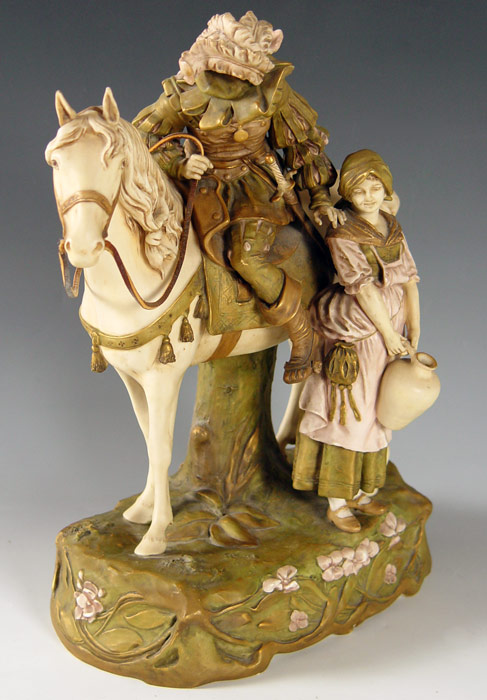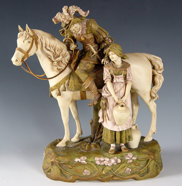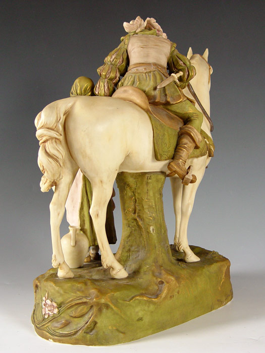 FINE ROYAL DUX PORCELAIN FIGURAL GROUP: Early 20th C. figural group of horse, rider, and maiden. Iridescent glaze. 15 1/2''h., 14'' long. Applied pink triangle mark.