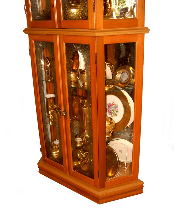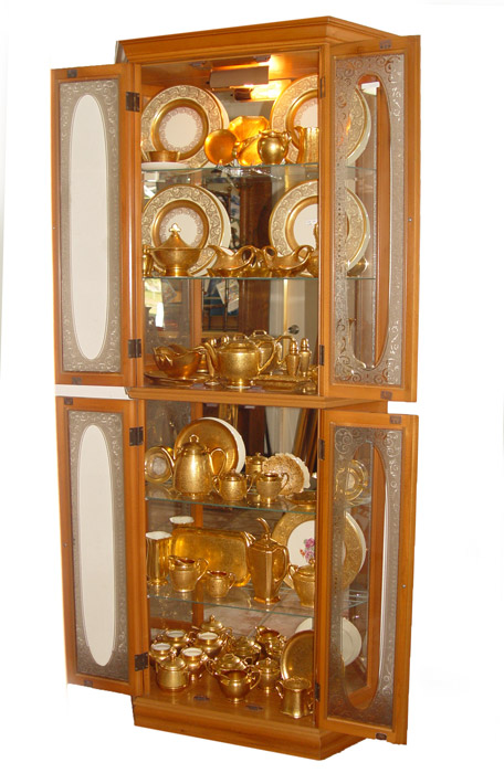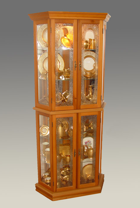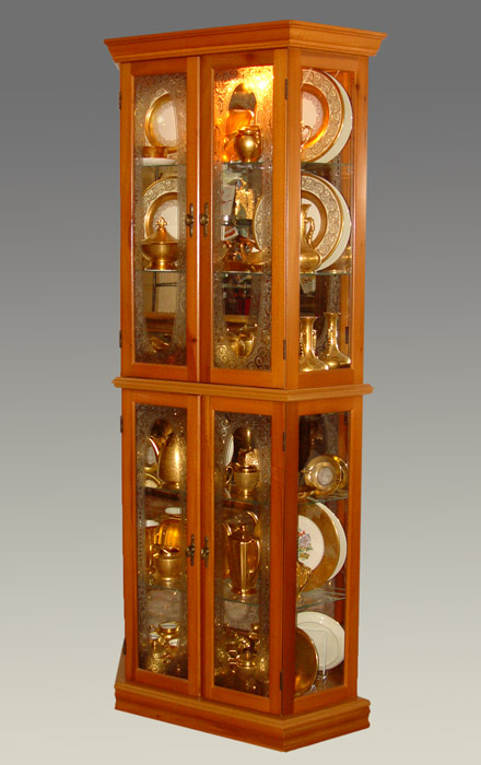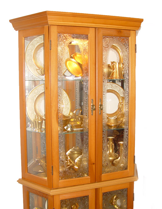 PULASKI FURNITURE UPRIGHT DISPLAY CABINET: Exterior with etched glass. Illuminated interior with glass shelves and mirror back. 76'' tall, 34 1/2'' wide, 10 1/2'' deep.