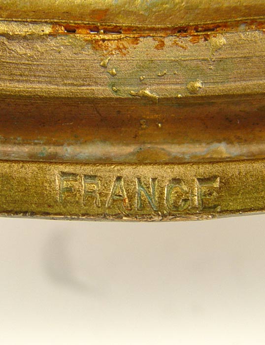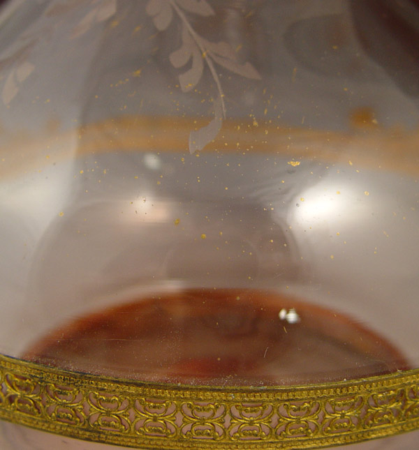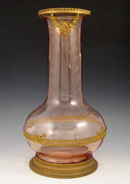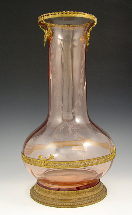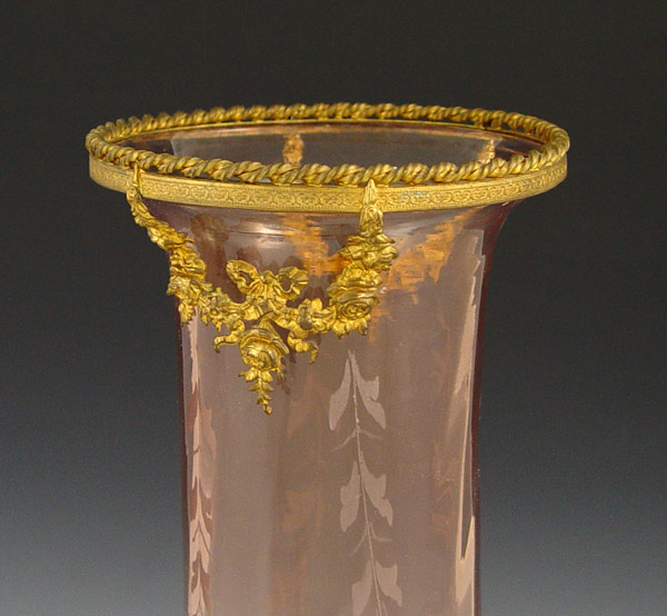 EARLY 20TH C METAL MOUNTED PINK GLASS VASE: Tall etched glass with metal base, band, and rim. Approx 16.5'' h.