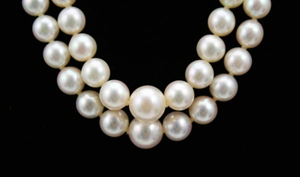 DOUBLE STRAND CULTURED PEARLS: Double strand of graduated cultured pearls. 5.00 - 8.50 mm. Cream color with high luster. 14K white gold clasp with rhodolite garnet. 20'' in length.