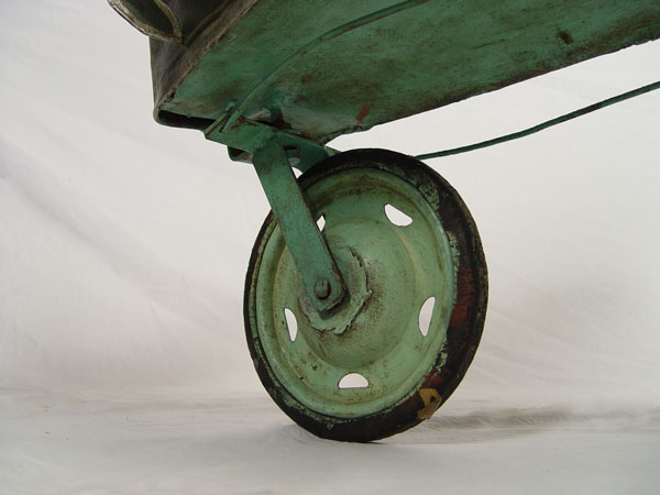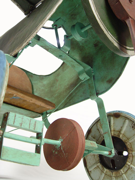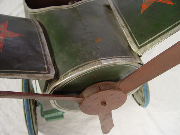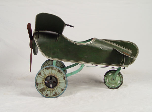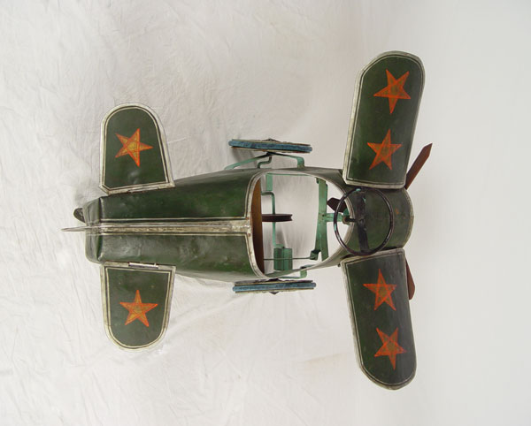1950'S CHILD'S PLANE PEDAL CAR: Appears to be handmade, custom plane circa 1950's. Green paint with red stars. Measures 27 1/2'' h. x 41'' x 35 1/2''