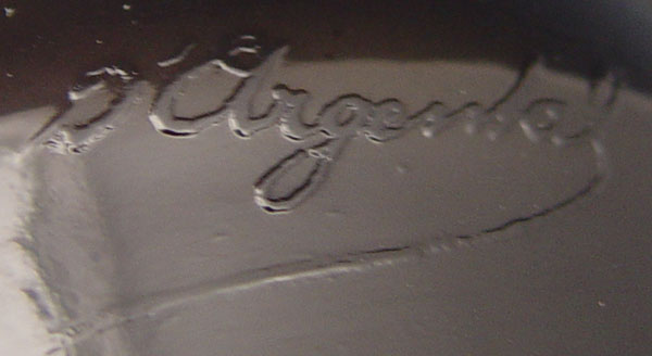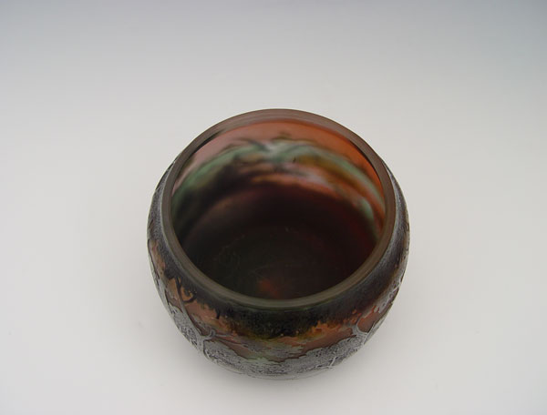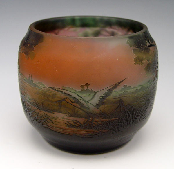D'ARGENTAL FRENCH CAMEO GLASS VASE: Violet and green cut in a waterbird in landscape design. 3 1/2'' tall.