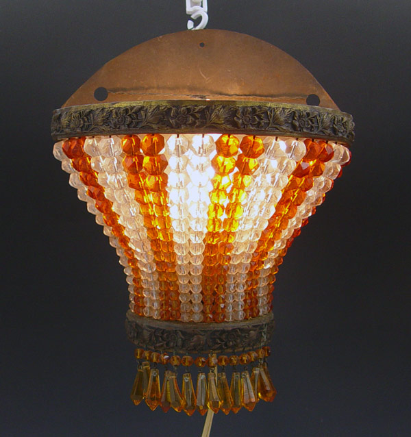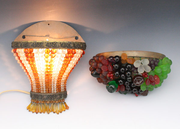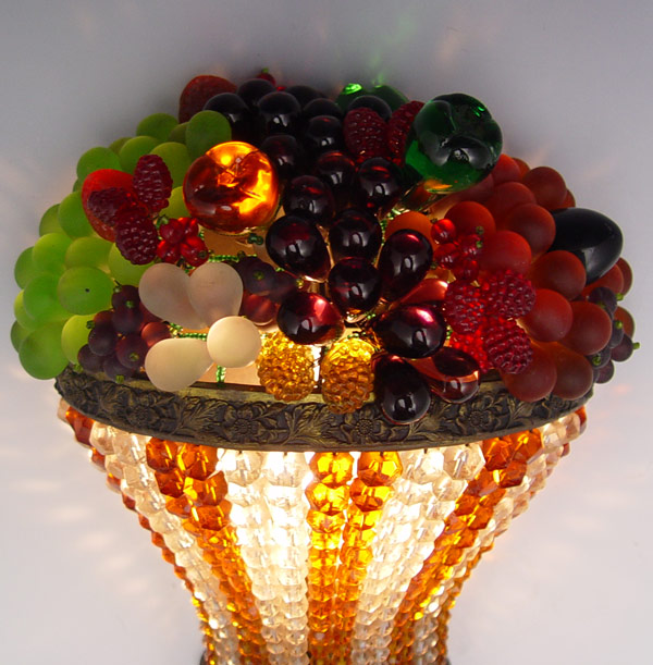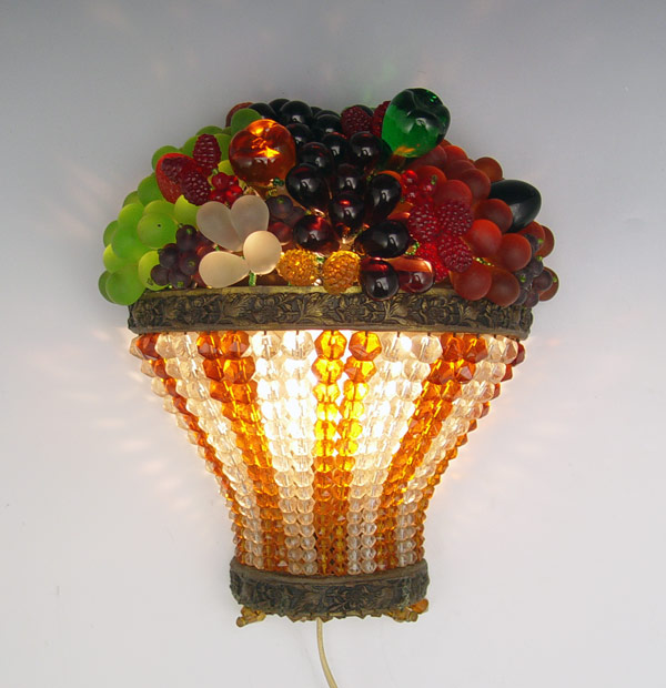 SIGNED CZECH GLASS FRUIT BASKET SCONCE WALL LAMP: Faceted glass beaded ''basket'', glass fruit shade. 10''h., 9'' wide.