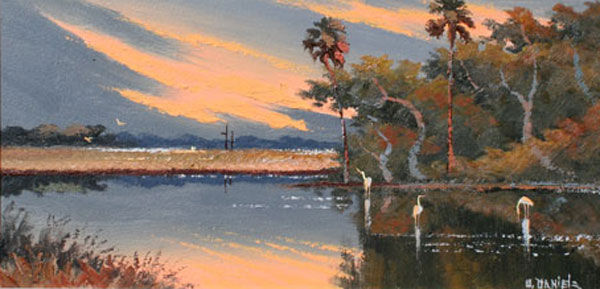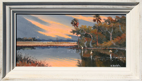 DANIELS, Willie, (American, 20th Century): Florida Highwaymen, Sunset backwater scene with birds. OIL/Masonite. 12'' x 24'', framed 16 1/2'' x 28''