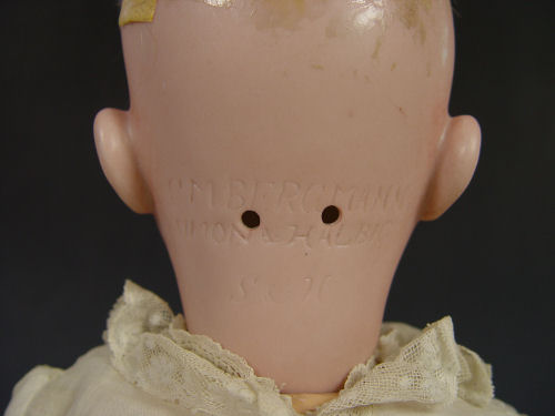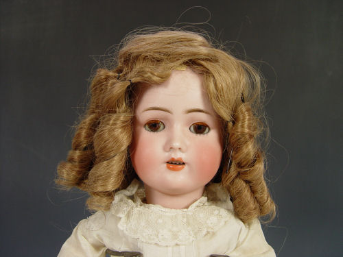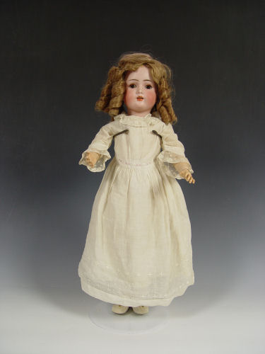 24'' ANTIQUE SIMON & HALBIG BISQUE HEAD DOLL: Bisque head marked CM Bergmann / Simon & Halbig / S&H. Sleepy brown eyes with lashes, open mouth showing 4 teeth, curly wig. Composition body, fully jointed. Dressed in white cotton dress of the period.